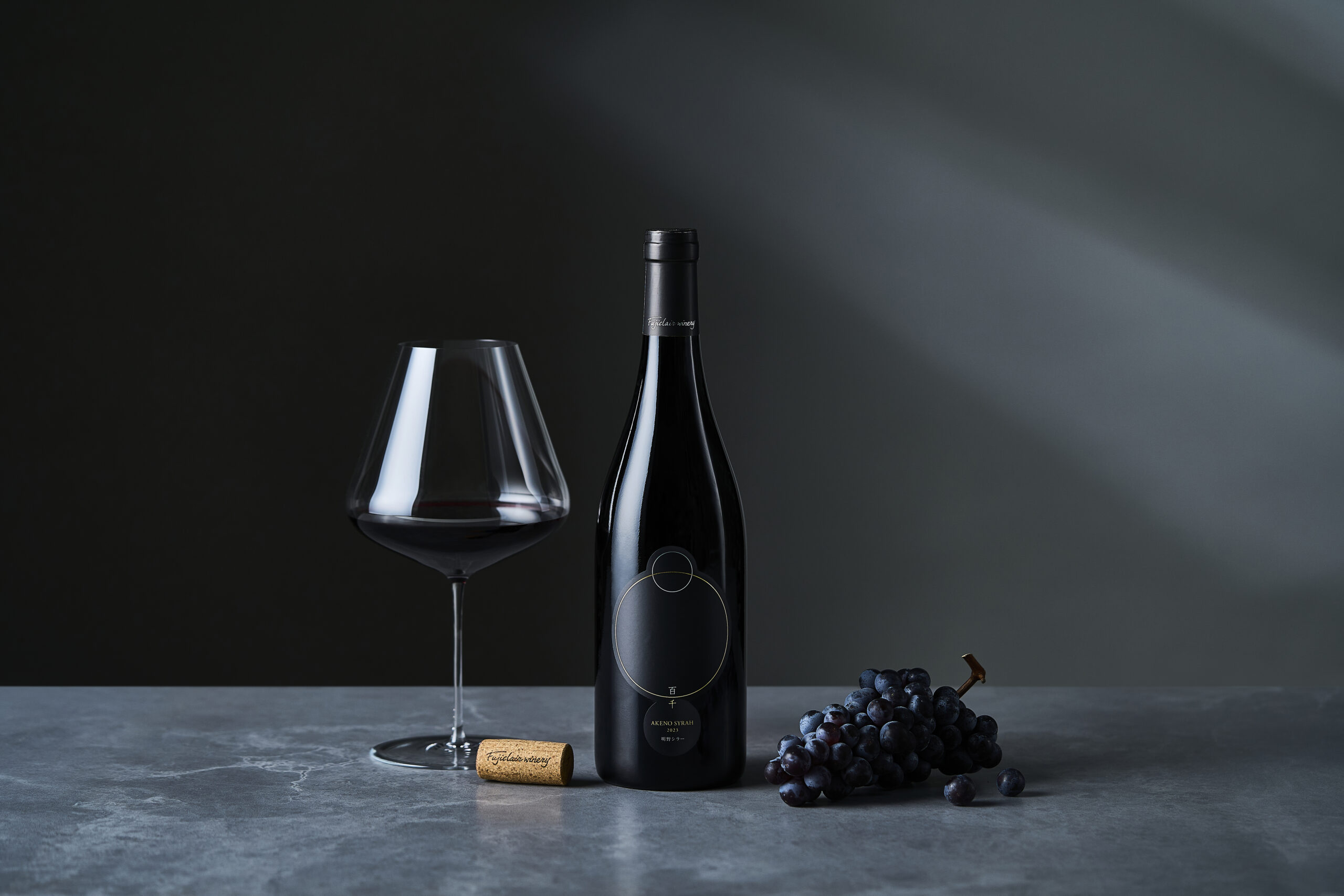 「百千」シリーズは、フジクレールワイナリーの新たな幕開けとなるものでもあります。これまで展開してきた「フジクレール」「クラノオト」「LADY beetle」のさらに上位クラスのワインを目指し、デザインは黒を貴重とした高級感のあるテイストに仕上げました。ラベル中央には、金と銀の箔で描かれた2つの円が重なり、百と千を表しております。